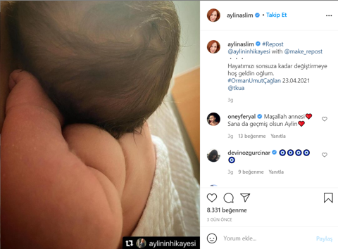 Orman Umut Çağlan adını verdiği oğlunun fotoğrafını paylaşan Aylin Aslım, gönderisine “Hayatımızı sonsuza kadar değiştirmeye hoşgeldin oğlum” notunu düştü.