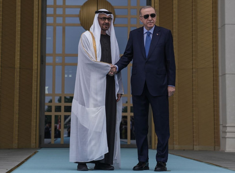 Cumhurbaşkanı Erdoğan ve Al Nahyan, merdivenlerde Türkiye ve BAE bayrakları önünde tokalaşarak basın mensuplarına poz verdi.