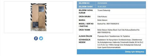 Galerinin tamamı için tıklayınızBella Maison" marka "Black Oud" oda kokusunun piyasaya arzı yasaklandı, mevcut ürünlerin de toplatılması kararlaştırıldı.