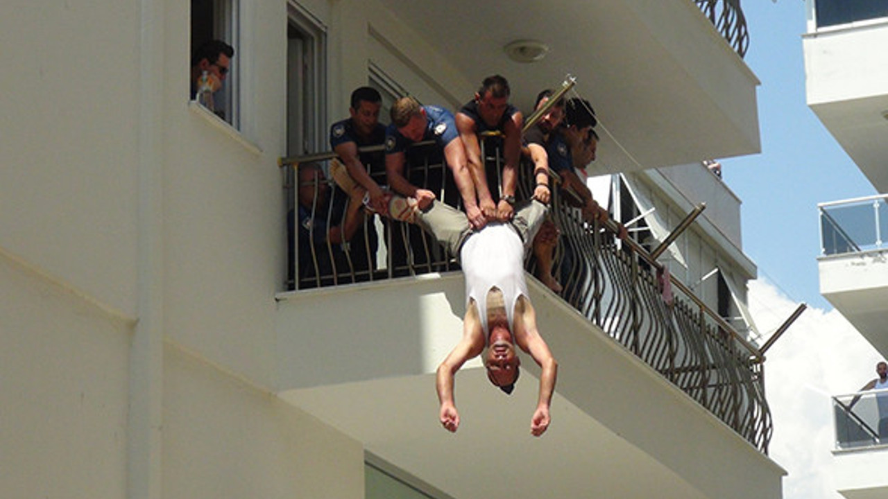 Antalya'nın Manavgat ilçesinde yeğeninin yanına misafirliğe gelen ve şizofren hastası olduğu iddia dilen şahıs evde kimsenin bulunmadığı bir anda kriz geçirdi. Evin kapı ve pencerelerini kilitleyerek kimsenin girmesine izin vermeyen şahıs polise zor anlar yaşattı. Edinilen bilgiye göre, Eskihisar Mahallesi'ne yeğeninin yanına misafirliğe gelen ve şizofren hastası olduğu ileri sürülen Osman G. evde kimsenin bulunmadığı bir anda kriz geçirdi. Osman G. evin kapı ve pencerelerini kilitleyerek kimsenin girmesine izin vermeyince polise haber verildi. Tüm çabalara rağmen Osman G. kapıyı açmazken, polis, itfaiye merdiveniyle 2. katta bulunan dairenin penceresinden içeriye biber gazı sıkarak girdi. Polisleri kendisine yaklaştırmayan Osman G. eline geçirdiği malzemeleri aşağıya atarken, elinde ekmek bıçağıyla balkona, oradan da balkon korkuluklarının dışına çıktı. Gerek yakınları gerekse polislerin ikna çabaları karşısında direnen ve elindeki bıçağı yakınına gelenlere sallayan Osman G. 1,5 saati aşkın bir süre korkuluk demirlerine asılı bir şekilde direndi. Bu sırada aşağıya düşme ihtimaline karşısında itfaiye görevlileri balkonun altına şişme yatak koydu. Zaman geçtikçe yorulan Osman G.’nin bir anlık dalgınlığını değerlendiren 2 polis memuru elindeki bıçağı alarak ayaklarından sıkıca tuttu. Balkondaki polisler ve yakınları Osman G.’yi ayaklarından yakalarken, itfaiyenin merdivenine çıkan 2 polis memuru şahsı uzun uğraşlar sonucunda güçlükle ellerini kelepçeleyerek balkondaki polislerin yukarıya çekmesini sağladı. Sedyeye bağlanarak indirilen Osman G, ambulansla hastaneye kaldırıldı.