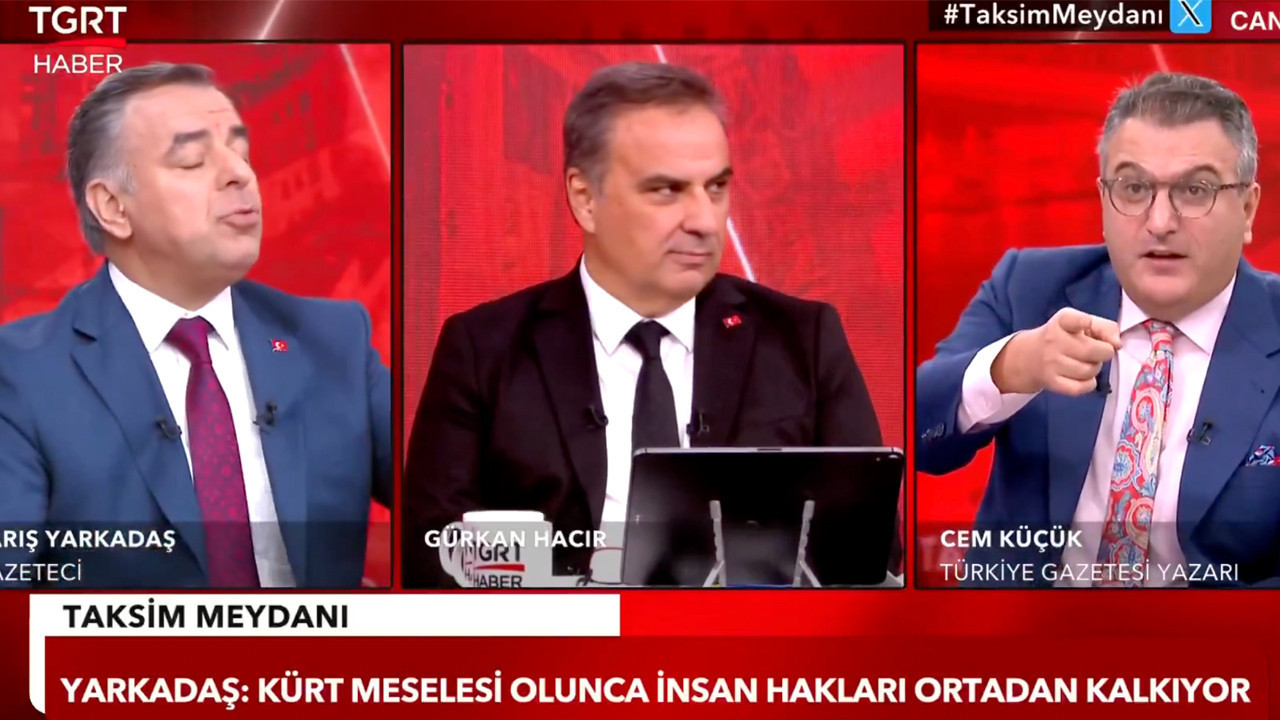 TGRT Haber ekranlarında canlı olarak yayınlanan Taksim Meydanı programında dün akşam yine sesler yükseldi, ortam geridli. Gazeteci Barış Yarkadaş'ın Ben hayatımda AK Parti'ye oy vermedim, vermem de. Milliyetçi Hareket Partisi'nin önünden geçmedim, geçmem de oy vermem de. Ben CHP'ye oy veriyorum" sözleri Cem Küçük'ü kızdırdı. Cem Küçük'ün "Bu saatten sonra CHP'ye de vermezsin" sözleri ortamı gerdi.