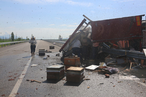 Galerinin tamamı için tıklayınızBayburt'ta arı kovanı yüklü tırın devrilmesi sonucu bir kişi yaralandı, etrafa saçılan arıların sokması nedeniyle itfaiye eri, trafik polisi ve arıcı hastaneye kaldırıldı. Samsun'dan Erzurum'a arı kovanı taşıyan Selim Kalender idaresindeki 53 K 1912 plakalı tır, Gümüşhane-Bayburt karayolu Nişantaşı köyü mevkisinde refüje devrildi. Kazada hafif yaralanan sürücü Kalender, Bayburt Devlet Hastanesine kaldırıldı.