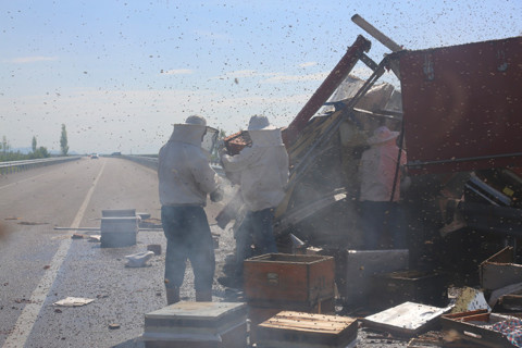 Bayburt'ta arı kovanı yüklü tır devrilince
