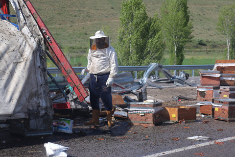 Bayburt'ta arı kovanı yüklü tırın devrilmesi sonucu bir kişi yaralandı, etrafa saçılan arıların sokması nedeniyle itfaiye eri, trafik polisi ve arıcı hastaneye kaldırıldı. Samsun'dan Erzurum'a arı kovanı taşıyan Selim Kalender idaresindeki 53 K 1912 plakalı tır, Gümüşhane-Bayburt karayolu Nişantaşı köyü mevkisinde refüje devrildi. Kazada hafif yaralanan sürücü Kalender, Bayburt Devlet Hastanesine kaldırıldı. Kovanlardan çevreye dağılan arılar nedeniyle polis, jandarma, itfaiye ve sağlık ekipleri kaza yerine yaklaşmakta zorlandı. 3 KİŞİ HASTANEYE KALDIRILDI: Yaralı sürücüyü devrilen araçtan çıkarmak için çalışma yapan itfaiye görevlilerinden biri ile trafik polisi ve olay yerinde çalışma yapan arıcılardan birini çok sayıda arı soktu. Bu kişiler sağlık ekiplerince Bayburt Devlet Hastanesine kaldırılarak tedavi altına alındı. Kazayı duyan bölgedeki arıcılar, özel kıyafetleriyle arı kovanlarını toplama çalışmasına katıldı.