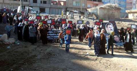 BDP Nusaybin İlçe binası önünde toplanan kadınlar, Öcalan posterleri açtıktan sonra, PKK ve Öcalan lehine sloganlar atarak, 27 Nisan Caddesi’ne yürüdü.