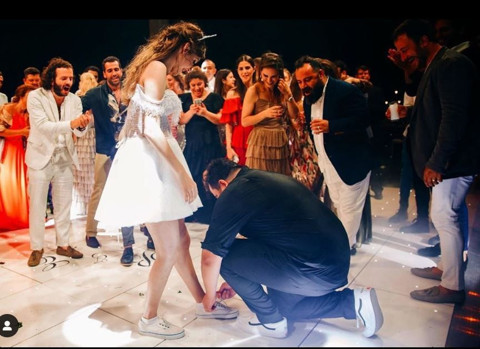 Galerinin tamamı için tıklayınızKumsal olduğu için spor ayakkabı giymeye karar vermiştik. Bir tasarımcıya ayakkabıları gönderdik. Üzerinde Mr. Yenenler, Mrs. Yenenler tarzı bir şey yazacak. Düğünden bir gün önce ayakkabılar bize geldi ve adam keçeli kalemle yazmış!