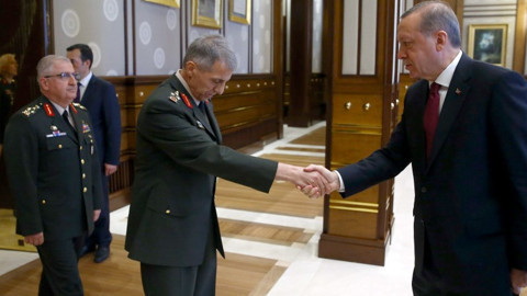 Cumhurbaşkanı Recep Tayyip Erdoğan ile komuta heyeti Cumhurbaşkanlığı Sarayı'nda yaklaşık yarım saat görüştü. Cumhurbaşkanı Recep Tayyip Erdoğan, Genelkurmay Başkanı Orgeneral Hulusi Akar ve kuvvet komutanlarını Cumhurbaşkanlığı Sarayı'nda kabul etti. Basına kapalı gerçekleşen kabulü yaklaşık yarım saat sürdü. Görüşme, Yüksek Askeri Şura (YAŞ) toplantısı sonrası ilk görüşme olma özelliği taşıyor.