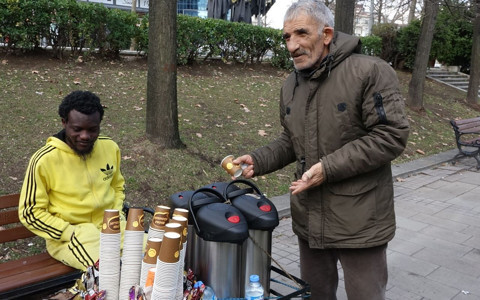 Galerinin tamamı için tıklayınızParkta seyyar satıcılık yapan bir çaycı üşüdüğünü düşündüğü kişiye çay ikram etmek istedi.