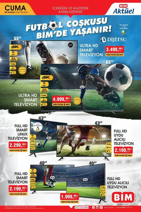 Galerinin tamamı için tıklayınızAktüel kataloğun ilk sayfasında 55 ve 65 ekran ultra HD smart televizyonlar bulunuyor. TV ağırlıklı sayfada yine 43 ekran full HD smart Linux TV, 43 ekran uydu alıcılı TV ve 40 ekran full hd uydu alıcılı TV yer alıyor.