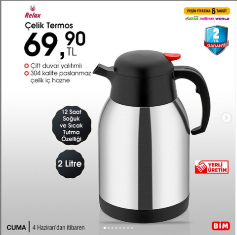 BİM aktüel kataloğu 4 haziran broşürü günler öncesinden sosyal medyada yayınlandı. Yasakların kalkması ile birlikte yaz sezonu başladı, tatil hazırlıkları hız kazandı. Bugün, BİM 4 haziran aktüel kataloğunda kamp ve tatil ürünleri ön plana çıkıyor. 12 saat suyu sıcak tutan termos 149 liradan satılırken 2 litrelik çelik çay termosu 69 liradan satılıyor. İşte BİM aktüel kampanyalı 4 haziran ürünleri Aktüel kataloğun ilk sayfasında 55 ve 65 ekran ultra HD smart televizyonlar bulunuyor. TV ağırlıklı sayfada yine 43 ekran full HD smart Linux TV, 43 ekran uydu alıcılı TV ve 40 ekran full hd uydu alıcılı TV yer alıyor.Aktüel ürünlerin ikinci sayfasında ise motosiklet kask sistemi, çok fonksiyonlu özel sırt çantası, kablosuz mini kompresör ve powerbank, motosiklet lastik ve ısı basınç kontrol sistemi, motosiklet çantası, cilalı oto şampuanı, motosiklet selesi, boyun askısı ve çok amaçlı plastik kancalı file gibi ürünler bulunuyor.Aktüel kataloğun son sayfasında ise 500 ml termos, 2 litre çelik termos, desenli viskon uzun etek, ergonomik sandalet çeşitleri, kavanoz kapakları ve çocuk terlik çeşitleri yer alıyor.