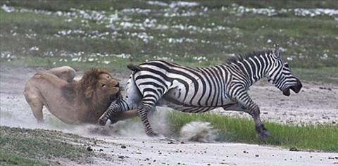 Bu kez dişleri zebranın arka bacaklarında ama yine başaramıyor.