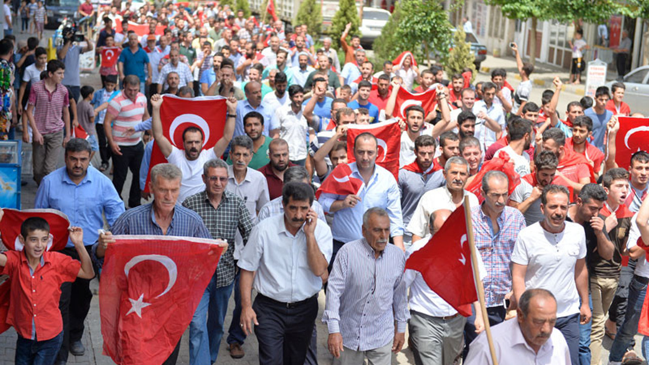 Mardin'in Ömerli ilçesinde PKK'lı teröristlerce bomba yüklü araçla İlçe Jandarma Komutanlığına düzenlenen saldırı protesto edildi. Ömerli-Midyat karayolundaki Ömerli İlçe Jandarma Komutanlığı binası nizamiyesine, dün akşam saat 20.25 sıralarında teröristlerce bomba yüklü araçla düzenlenen, bir tır sürücüsünün hayatını kaybettiği, askerlerin de aralarında bulunduğu 16 kişinin yaralandığı saldırıya tepki gösteren aralarında kadın ve çocukların da bulunduğu grup, ilçe merkezinde toplandı. Ellerinde Türk bayrakları bulunan ve İlçe Emniyet Müdürlüğüne kadar yürüyen grup sık sık tekbir getirerek, "şehitler ölmez vatan bölünmez", "kahrolsun PKK", "vatan sana canım feda" şeklinde sloganlar attı. Yürüyüşe katılan vatandaşlar, emniyet müdürlüğü önünde bekleyen polislere moral ve birlik, beraberlik mesajı verdi. İstiklal Marşı'nın okunması sırasında bazı vatandaşlar polislere sarıldı. Grup daha sonra saldırının yaşandığı İlçe Jandarma Komutanlığına kadar yürüdü. Burada, vatandaşların askerlere sarılarak, saldırıdan duydukları üzüntüyü dile getirmesi üzerine patlamada yaralanan askerlerin yakınları gözyaşlarına hakim olamadı. Teröre tepki gösteren vatandaşlardan Zeki İpekşen, halkın huzurunu bozmaya yönelik terör saldırısını kınadıklarını söyledi. Bu tür zorlukları birlik ve beraberlik içinde göğüsleyerek atlatacaklarına inandıklarını ifade eden İpekşen, "Bu menfur saldırıyı şiddet ve nefretle kınıyoruz. Bu ülkede herkesin kardeşçe yaşayabileceği toprağımız mevcut. Ama maalesef bunu bize zehir eden bir kitle var. Allah bu kitleyi bildiği gibi yapsın. Ama hiçbir şekilde ilçemizin huzurunu bozamayacaklar." dedi. Yürüyüşe katılan bir kişi güvenlik güçlerine seslenerek, "Buradan bütün güvenlik kuvvetlerine sesleniyorum. Korkmayın, hüzünlenmeyin. Allah da peygamber de millet de sizinledir." ifadelerini kullandı.