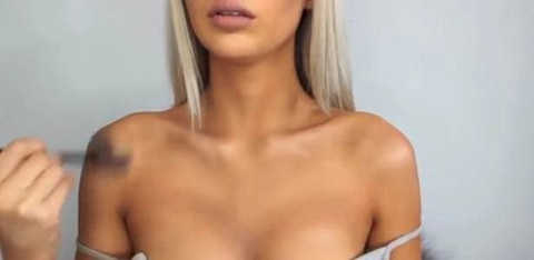 Galerinin tamamı için tıklayınızSonra eline aldığı bir makyaj fırçasıyla göğüs dekolte bölgesini biraz pudra ile renklendirip renk geçişlerini dağıtıyor.