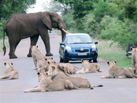 Galerinin tamamı için tıklayınızMavi bir araçla ilerleyen turistler bir anda kendini aslan sürüsü ve dev bir filin arasında sıkışmış halde buldu.