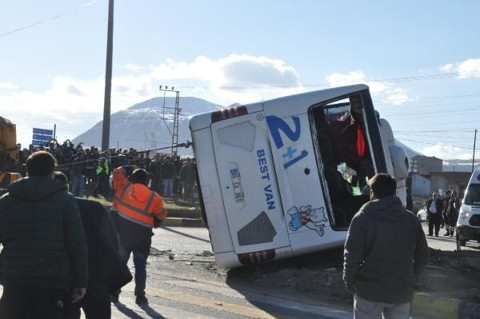 BİTLİS'in Tatvan ilçesinde, yolcu otobüsü ile TIR'ın çarpışması sonucu meydana gelen kazada, sürücüler ve 32 kişi yaralandı.Kaza, Tatvan'ın çıkışında bulunan Bitlis-Tatvan kavşağında meydana geldi.Bitlis'ten Ahlat ilçesi yönüne giden sürücüsünün ismi öğrenilemeyen 22 BE 825 plakalı TIR ile Tatvan'dan Bitlis yönüne gitmek için ismi bilinmeyen sürücüsünün kavşaktan dönmeye çalıştığı 65 EA 361 plakalı 'Best Van Turizm' firmasına ait yolcu otobüsü çarpıştı.Araçların devrildiği kazada, sürücüler ile 32 yolcu yaralandı.İhbarla olay yerine gelen sağlık görevlileri, 34 yaralıyı ambulanslarla Bitlis ve Tatvan'daki hastanelere kaldırdı.Polis, kazayla ilgili soruşturma başlattı.