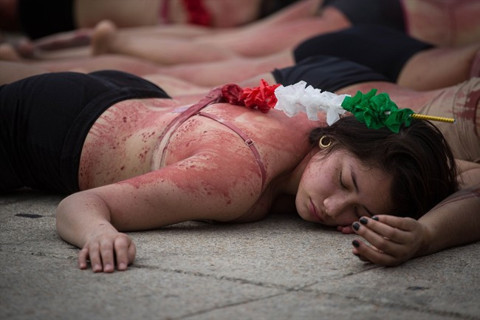 Meksika'nın başkenti Meksiko'da boğa güreşleri protesto edildi. Devrim Anıtı önünde toplanan bir grup, vücutlarına kırmızı boya sürüp uzunca bir süre yerde yatarak eylem yaptılar.