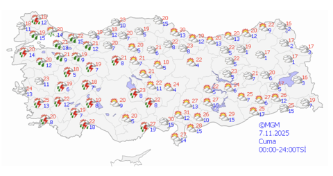 Galerinin tamamı için tıklayınızMeteoroloji'den yapılan uyarıda, "Yağışların Kırklareli kıyıları, Antalya çevreleri ile Mersin'in Toroslar mevkiinde yer yer kuvvetli olması beklendiğinden yaşanabilecek olumsuzluklara karşı dikkatli ve tedbirli olunması gerekmektedir" denildi. İşte 7 Kasım Cuma bölge bölge hava durumu...