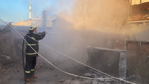 İtfaiye erlerinin soğutma çalışmaları yaptığı evdeki yangınla