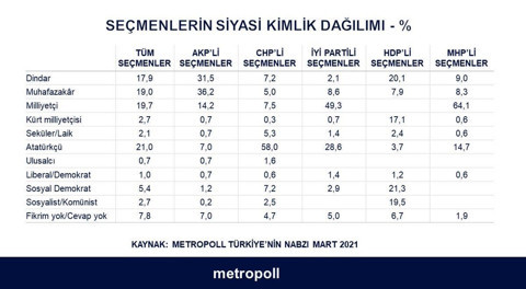 Metropoll'ün anketinde seçmenlere kendilerini hangi siyasi kimlikle gördükleri soruldu. Seçmenlerin yüzde 17.9'u kendini dindar olarak nitelendirirken, 19'u muhafazakar, 19.7'si milliyetçi, 2.7'si Kürt milliyetçisi, 2.1'i seküler ya da laik, yüzde 21'i Atatürkçü, binde 7'si ulusalcı, yüzde 1'i liberal/demokrat, yüzde 5.4'ü sosyal demokrat, yüzde 2.7'si sosyalist/komünist olarak tanımladı.
