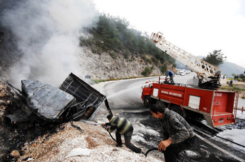 Galerinin tamamı için tıklayınızMuğla-Marmaris karayolunun 24. kilometresinde sürücüsü ve plakası henüz belirlenemeyen kimyasal madde yüklü kamyon, kayalıklara çarptı. Kamyonun sürücüsü, çarpma nedeniyle camdan fırlayarak yola düştü. Kamyondaki iki kişi, kazanın ardından yanmaya başlayan araçta yaşamını yitirdi.