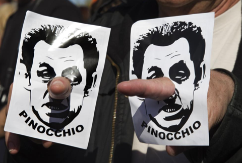 olan Sarkozy "Pinokyo" göndermeli pankartlarla protesto edildi.
