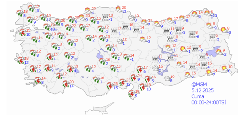 Galerinin tamamı için tıklayınızMeteoroloji yurt geneli hava durumu tahmin raporu paylaştı. Yağışların dört gün boyunca sürmesi öngörülürken Meteoroloji Genel Müdürlüğü'nden kuvvetli yağış, buzlanma ve don uyarısı geldi. Öte yandan Ardahan, Ağrı, Kars, Bitlis, Muş, Erzurum ve Bayburt illerinde hafta sonu kar yağışının olacağı öngörülüyor.