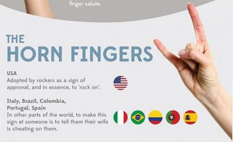 Boynuz Parmaklar işareti ABD’de rock simgesi olarak kullanılıyor.İtalya, Brezilya, Kolombiya, Portekiz, İspanya’da ‘eşin seni aldatıyor’