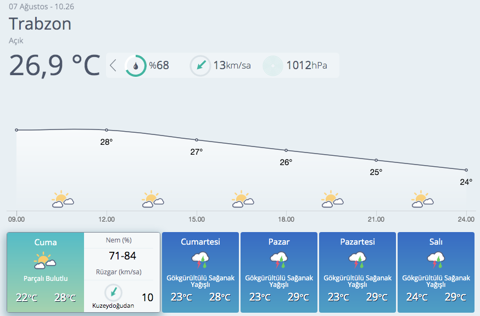Giresun, Trabzon, Rize ve Artvin'in iç kesimlerinin yerel olmak üzere sağanak ve gök gürültülü sağanak yağışlı, diğer yerlerin az bulutlu ve açık geçeceği tahmin ediliyor. Hava sıcaklığı Hava sıcaklığının kıyı Ege'de 1 ila 3 derece azalacağı, diğer yerlerde önemli bir değişiklik olmayacağı tahmin ediliyor.Kuvvetli rüzgar uyarısı Rüzgarın genellikle kuzey ve kuzeydoğu, Akdeniz kıyıları ile Güneydoğu Anadolu'da batı ve güneybatı yönlerden hafif, ara sıra orta kuvvette, Trakya'da yer yer kuvvetli olarak (40-60 km/sa) esmesi bekleniyor. Yaşanabilecek olumsuzluklara karşı dikkatli olunması gerekmektedir.İşte il il ve 5 günlük hava durumu raporu...