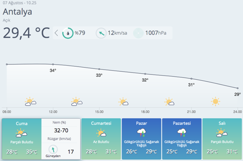 Giresun, Trabzon, Rize ve Artvin'in iç kesimlerinin yerel olmak üzere sağanak ve gök gürültülü sağanak yağışlı, diğer yerlerin az bulutlu ve açık geçeceği tahmin ediliyor. Hava sıcaklığı Hava sıcaklığının kıyı Ege'de 1 ila 3 derece azalacağı, diğer yerlerde önemli bir değişiklik olmayacağı tahmin ediliyor.Kuvvetli rüzgar uyarısı Rüzgarın genellikle kuzey ve kuzeydoğu, Akdeniz kıyıları ile Güneydoğu Anadolu'da batı ve güneybatı yönlerden hafif, ara sıra orta kuvvette, Trakya'da yer yer kuvvetli olarak (40-60 km/sa) esmesi bekleniyor. Yaşanabilecek olumsuzluklara karşı dikkatli olunması gerekmektedir.İşte il il ve 5 günlük hava durumu raporu...