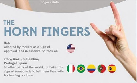Boynuz parmaklar işareti ABD'de rock simgesi olarak kullanılıyor. İtalya, Brezilya, Kolombiya, Portekiz, İspanya'da 'eşin seni aldatıyor'