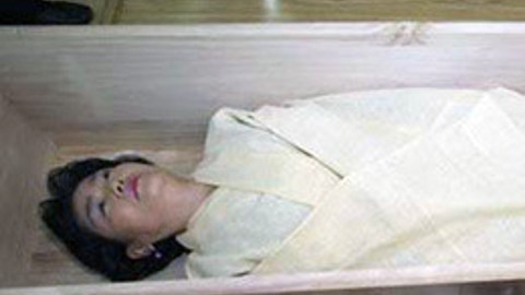 42 yaşındaki iki çocuk annesi Lee Myung-hee, bir tabut içine girmek