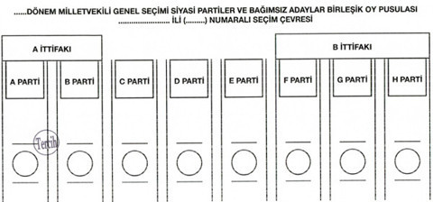 Galerinin tamamı için tıklayınızİttifak alanı içerisinde yer alan siyasi partilerden hangisine ait olduğu belirlenemeyen ancak ittifak alanına basılan "EVET" veya "TERCİH" mührü bulunan oy pusulası geçerli olup, bu oy ittifakın ortak oyuna sayılır.