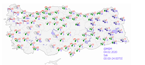 Meteoroloji Genel Müdürlüğü tarafından yapılan son değerlendirmelere göre; Ülkemiz genelinin parçalı ve çok bulutlu, Kıyı Ege, Akdeniz, İç Anadolu'nun doğusu, Karadeniz, Doğu ve Güneydoğu Anadolu, Manisa, Denizli, Uşak, Ankara, Çankırı, Edirne, Kırklareli, Çanakkale'nin güneyi ve Balıkesir'in batısı ile sabah saatlerinde İstanbul, Kocaeli ve Sakarya çevrelerinin yağışlı geçeceği tahmin ediliyor.