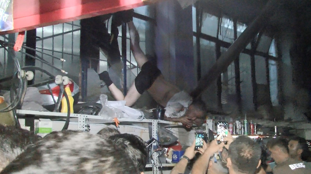 Olay, gece saatlerinde Osmangazi İlçesi Uluyol Caddesinde bulunan motosiklet tamir atölyesinde meydana geldi. İddiaya göre önceden atölyede çalışan 33 yaşındaki İsmail A. iş yerini soyduğu sırada yakalanmış ve iş yeri sahiplerinin şikayeti üzerine tutuklanarak cezaevine gönderilmişti. 10 gün ceza evinde yatan İsmail A. tahliye olduğu gün tekrar atölyeye gelerek yan tarafta bulunan oto yıkamanın çatısını kullanarak atölyenin arada bulunan demir parmaklıklarını önce kesti. Can havliyle çığlık atmaya başladı: Sonrasında camları kırarak içeri girmeye çalıştı. Bu sırada 3 metre yükseklikte bulunan kırık camda ayağından asılı kalan İsmail A. yaralanarak çığlık atmaya başladı. Genç adam bu esnada devriye görevi yapan Çarşı ve Mahalle Bekçileri tarafından fark edildi. Bekçiler şüphelinin kaçmaması için önlem alıp takviye ekip istedi. Olay yerine çok sayıda polis ekibi sevk edilirken İsmail A.'yı asılı kaldığı yerden çıkaran ekipler yaralı adamı ambulansa bindirerek Bursa Devlet Hastanesine kaldırdı. Dükkan sahibi Ertan Tüzen ise daha önceden elamanı olan ve psikolojik sorunları olduğu için sürekli evden kaçan şahsı görünce şok oldu. İsmail A.'nın evden kaçtığını ve annesinin sürekli oğlunu aradığını belirten Ertan Tüzen, annesini arayarak durumu bildirdi. Gazetecilerin sorularını cevaplayan iş yeri sahibi Ertan Tüzen, '' Daha önce de bizde çalıştığı zamanlar bizden habersiz gece dükkana gelip çilingir çağırarak kapıyı açtırmış ve zaman zaman mal çalarak devam etmiş. Haberimiz yokken bir gece dükkana geldiğimizde şans eseri yakaladık. 10 gün ceza evinde yattı, sonra çıktı geldi. Yeniden soymaya çalıştı. Fakat yine yakalandı'' dedi. Tüzen eski çalışanı İsmail A.'dan şikayetçi oldu. Yaralı olarak hastaneye kaldırılan İsmail A.'nın sağlık durumunun iyi olduğu öğrenildi.