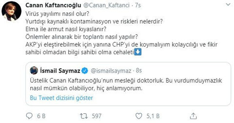 Galerinin tamamı için tıklayınızCanan Kaftancıoğlu ise ''Virüs yayılımı nasıl olur? Yurtdışı kaynaklı kontaminasyon ve riskleri nelerdir? Elma ile armut nasıl kıyaslanır? Önlemler alınarak bir toplantı nasıl yapılır? AKP’yi eleştirebilmek için yanına CHP’yi de koymalıyım kolaycılığı ve fikir sahibi olmadan bilgi sahibi olma cehaleti'' diyerek Saymaz'a yanıt verdi.