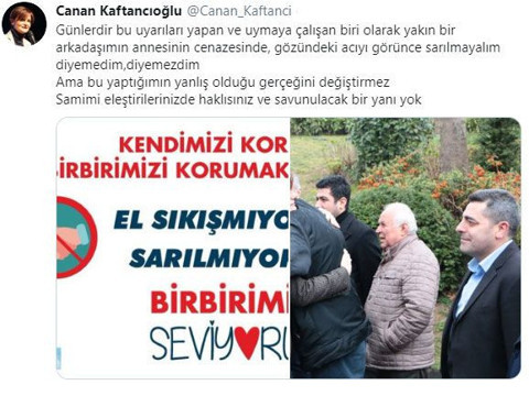 Galerinin tamamı için tıklayınızArdı ardına gelen tepkiler üzerine CHP İstanbul İl Başkanı Canan Kaftancıoğlu, twitter adresinden yeni bir paylaşım yaparak yaşananlardan özür diledi. Kaftancıoğlu, paylaştığı cenaze fotoğrafıyla ilgili "Günlerdir bu uyarıları yapan ve uymaya çalışan biri olarak yakın bir arkadaşımın annesinin cenazesinde, gözündeki acıyı görünce sarılmayalım diyemedim,diyemezdim Ama bu yaptığımın yanlış olduğu gerçeğini değiştirmez Samimi eleştirilerinizde haklısınız ve savunulacak bir yanı yok." mesajını paylaştı.