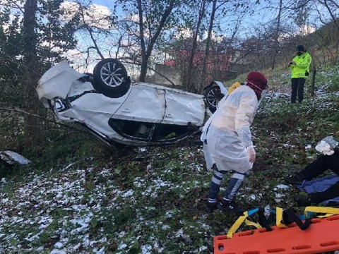 Galerinin tamamı için tıklayınızYakup Karaoğlu yönetimindeki 34 BLN 423 plakalı otomobil, bölgedeki kar yağışı sonrası oluşan buzlanma nedeniyle kontrolden çıkarak fındık bahçesine düştü.