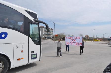 Galerinin tamamı için tıklayınızHazırlıklarını sürdüren Besim Vatan, büyük bir afişe 'Tuğba Seni Çok Seviyorum’ diye yazarak Edirne Otogarı’nın önünde beklemeye başladı. Anlaşma gereği de otobüsün muavini, Edirne’ye girişte flaş belleği genç kıza vererek içindeki görüntüyü koltuktaki ekrandan izlemesini istedi.