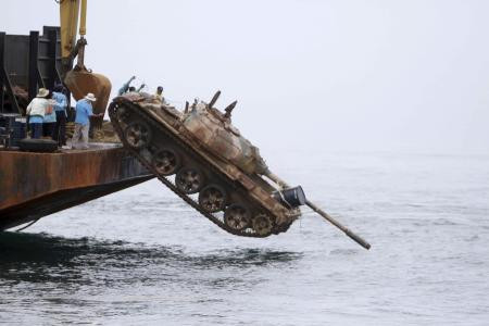 Galerinin tamamı için tıklayınızTayland Kraliçesi Sirikit'in başlattığı balık nüfusunun artırılması ve deniz eko-sistemlerinin iyileştirilmesi konulu proje kapsamında resif alanı olarak kullanılmak üzere sulara gömülen tanklar artık sorun çıkaramayacağı gibi en azından "hayırlı bir iş"e vesile olmuş olacak.