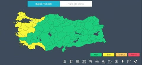 Kuvvetli yağış ve rüzgarın beklendiği, sarı kodlu uyarı yapılan iller... MGM tarafından Antalya, Balıkesir, Bilecik, Bursa, Çanakkale, Edirne, İstanbul, İzmir, Kırklareli, Kocaeli, Kütahya, Manisa, Muğla, Sakarya, Tekirdağ, Zonguldak, Yalova ve Düzce için sarı kodlu uyarı yapıldı.