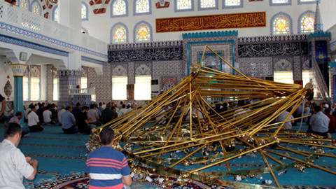 KAYSERİ'de cuma namazı öncesi caminin avizesinin cemaat üzerine düşmesi sonucu ilk belirlemelere göre 11 kişi yaralandı. Zümrüt Mahallesi'ndeki Ahmet-Ayşe İnci Camisi'nde, cuma namazı için cemaatin beklediği sırada, tavanda asılı büyük avize vatandaşların üzerine düştü. Cemaatin yardımıyla dışarı çıkartılan yaralılara, kısa sürede olay yerine ulaşan 112 Acil Servis ekipleri müdahale etti. İlk belirlemelere göre yaralanan 11 kişi, ambulanslarla çevredeki çeşitli hastanelere kaldırıldı. AVİZE BUGÜN TAKILMIŞTI Cami cemaatinden olayın görgü tanıkları, camiye bugün monte edilen avizenin, cuma namazı öncesi imamın vaaz verdiği sırada aniden cemaatin üzerine düştüğünü, vatandaşların başlarına aldıkları darbeyle yaralandıklarını anlattı.