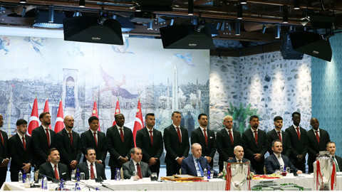Cumhurbaşkanı Recep Tayyip Erdoğan, Galatasaray futbol takımı oyuncularını ve teknik heyeti, Dolmabahçe Çalışma Ofisi'nde kabul etti. Cumhurbaşkanı Erdoğan sarı kırmızılı oyuncuları tek tek tebrik ederken Victor Osimhen ve Barış Yılmaz, Erdoğan'a forma hediye etti.