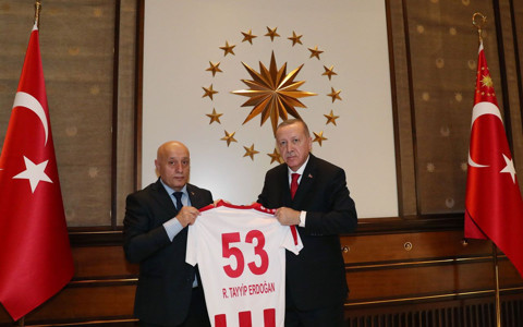 Kabulde Demir Grup Sivasspor Asbaşkanı Halit Yazıcı, Cumhurbaşkanı Erdoğan'a forma hediye etti.