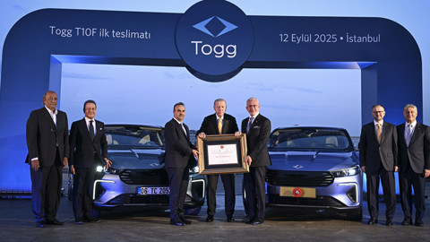 TOGG Yönetim Kurulu üyeleri, Cumhurbaşkanı Erdoğan'a otomobili Dolmabahçe'deki Çalışma Ofisi'nde teslim etti.Cumhurbaşkanı Erdoğan, plakasına Cumhurbaşkanlığı forsu takılan Togg'un mavi renkli yeni modeliyle test sürüşü yaparken, araç hakkında bilgi aldı.Cumhurbaşkanı Erdoğan'a test sürüşünün ardından, Sanayi ve Teknoloji Bakanı Mehmet Fatih Kacır ve TOGG Yönetim Kurulu Başkanı Fuat Tosyalı tarafından hediye verildi.Togg T10F'nin ilk teslim töreninde, Cumhurbaşkanlığı İletişim Başkanı Burhanettin Duran da hazır bulundu.Öte yandan Cumhurbaşkanı Recep Tayyip Erdoğan, 15 Eylül'de Türkiye'de satışa sunulacak Togg'un T10F modeline Tip Onay Belgesi verildiğini duyurdu. Cumhurbaşkanı Erdoğan, NSosyal hesabından yaptığı paylaşımda, "Yerli ve milli otomobilimiz Togg'un T10F modelinin Tip Onay Belgesi'ni verdik. İnşallah 15 Eylül Pazartesi Türkiye'de, kısa süre sonra da Avrupa'da satışa sunulacak olan T10F, ilk modelimiz T10X ile birlikte gurur kaynağımız olacak. Hayırlı, uğurlu olsun." ifadelerini kullandı.Togg'un iki modeli T10X ve T10F'nin Avrupa pazarındaki otomobillerin güvenliğinin değerlendirildiği bağımsız Euro NCAP programının tüm testlerinden en yüksek seviye olan 5 yıldız aldı.T10F, dört farklı teknik versiyon ve V1E, V1 ve V2 olmak üzere üç farklı donanım seçeneğiyle kullanıcılarla buluşacak. V1E Standart Menzil (RWD), V1 Uzun Menzil (RWD), V2 Uzun Menzil (RWD) ve V2 AWD (çift motorlu, dört çeker) seçenekleri bulunacak. 160 kW / 218 beygir güç ve 350 Nm tork üreten T10F RWD (arkadan itiş) versiyonlarına sahip olacak araç, 350 kilometreye ve 623 kilometreye varan menziller sunacak. 700 Nm tork üreten çift motorlu T10F AWD (dört çeker) versiyonu ise 88,5 kWh bataryasıyla 523 km WLTP menzile ulaşacak.T10F'te uzaktan güncellemelerle (OTA: over-the-air) sürekli kendini yenileyebilen sürücü destek sistemleri yer alıyor. T10F 7 adet hava yastığı, dayanıklı ve sağlam altyapısıyla her türlü yol koşulunda güvenli bir sürüş sağlıyor.Aracın, trafik işareti algılama sistemiyle birlikte çalışan dur-kalk fonksiyonlu akıllı adaptif hız sabitleyici ve akıllı şerit takip sistemi ve şeritten ayrılma ikazı gibi özellikleri bulunuyor. T10F, aynı zamanda V2 donanım seviyesinde çevre görüş kamerası, kör nokta asistanı, sürücü dikkat asistanı, gelişmiş elektronik denge kontrolü gibi özellikleri standart, otomatik park asistanını ise opsiyon olarak sunuyor. T10F, hızlı şarjla 30 dakikadan daha kısa sürede yüzde 20'den yüzde 80 batarya doluluk seviyesine ulaşabiliyor.T10F'in yeni dış renkleri "Urla" ve "Mardin" de Türkiye'nin güzelliklerinden ilhamla tasarlandı. T10F'in yeni rengi Urla, Ege'nin dinginliğini ve rafine zevklerini yansıtıyor. Urla yeşili, Ege'nin sakin gücünü T10F'in modern tasarımıyla buluşturarak kullanıcılarına yolculuklarında eşsiz bir doğallık katıyor. T10F'in yeni mavi rengi Mardin'in ilhamı ise Anadolu'nun kadim şehrinin tatlı mirası mavi badem şekerinden alındı.T10F tıpkı T10X gibi Togg'un dijital platformu Trumore ile bağlantılı bir deneyim sunacak. Kullanıcılar Trumore ile fintek, insurtek, blokzinciri, IoT, yapay zeka gibi yeni nesil teknolojilerle kişiselleştirilmiş, kullanıcı odaklı, akıllı ve empatik bir deneyimin parçası olacak.