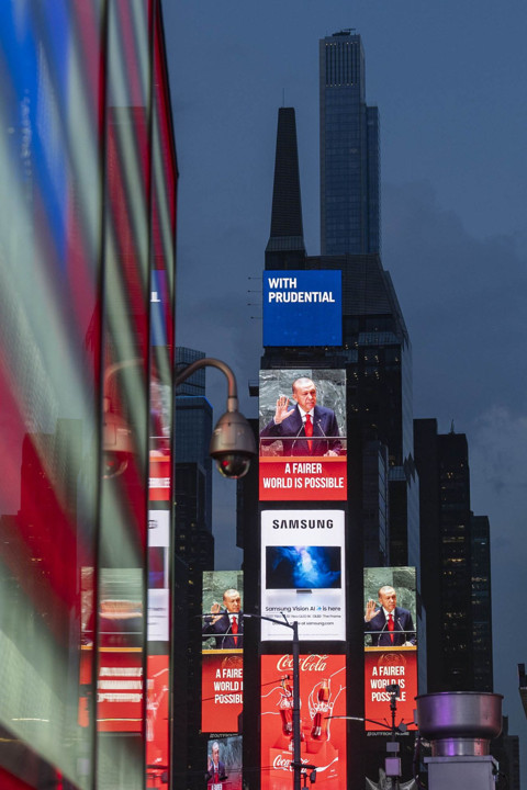 Galerinin tamamı için tıklayınızCumhurbaşkanlığı İletişim Başkanlığı koordinasyonunda Birleşmiş Milletler 80. Genel Kurulu’nun gerçekleştirildiği New York’un merkezindeki cadde ve sokaklar ile Times Meydanı'ndaki led ekranlarda Cumhurbaşkanı Recep Tayyip Erdoğan’ın “The World is Bigger than Five” (Dünya 5’ten büyüktür) sözü yansıtıldı.