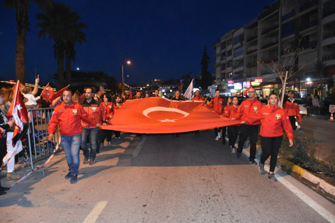 AYDIN'ın Kuşadası ilçesinde, Cumhuriyetin Kuruluşunun 95'inci yılı nedeniyle düzenlenen korteje yaklaşık 10 bin kişi katıldı.