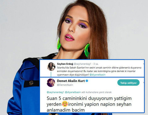 Galerinin tamamı için tıklayınızSeyhan Erdağ’ın; “İstanbul’da Sabah Ezanları’nın sesini ancak caminin dibine giderseniz duyarsınız evinizden duyamazsınız! Bu kadar ses kıstırıldığına göre demek ki insanlar uyanmasın diye düşünülüyor!” şeklinde bir tweetini gören Demet Akalın, yakından tanıdığı muhabirin paylaşımına; “Şuan 5 camininkini duyuyorum yattığım yerden… İroni mi yapıyorsun ne yapıyorsun Seyhan, anlamadım bacım” cevabını verdi.