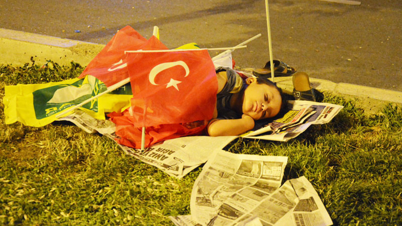 Tüm Türkiye'de Fetullahçı Terör Örgütü'nün (FETÖ) darbe girişimine tepkiler devam ediyor. Bazı şehirlerde vatandaşlar, FETÖ tarafından gerçekleştirilen darbe girişimine tepki olarak namaz kıldı. Türkiye'nin her ilinde demokrasi nöbetleri devam ederken vatandaşların yanısıra küçük çocuklar da nöbet tutuyor. Bayraklara sarılarak gazeteler üzerinde uyuyan küçük bir çocuk görenleri duygulandırdı.