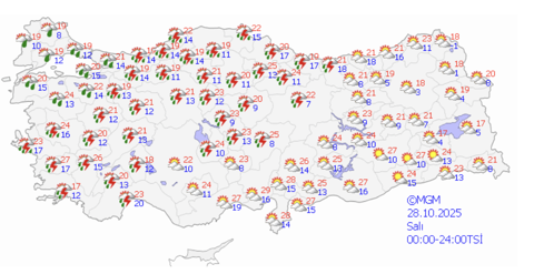 Bugünün haritalı hava durumu ve bazı illerin saatlik hava raporu şöyle: