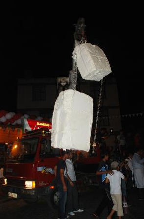 Galerinin tamamı için tıklayınızYaklaşık 300 kiloluk dondurma, vatandaşların ve davetlilerin şaşkın bakışları arasında otomobilin üzerine düştü. Otomobilde büyük çapta maddi hasar oluştu.